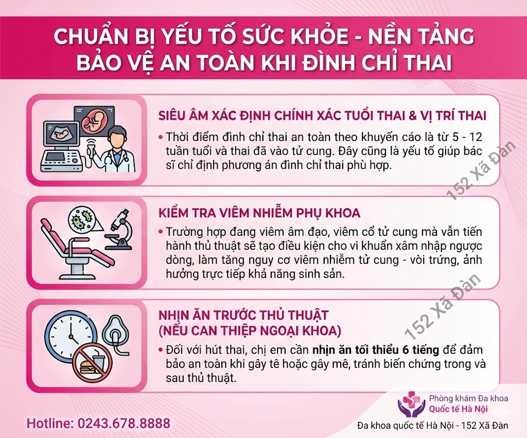Trong đình chỉ thai, sức khỏe hiện tại của phụ nữ quyết định trực tiếp mức độ an toàn của thủ thuật. Rất nhiều trường hợp gặp biến chứng không phải do phương pháp mà do can thiệp khi cơ thể chưa đủ điều kiện y khoa: thai chưa vào tử cung, đang viêm nhiễm nhưng không được xử lý trước hoặc bỏ qua các bước kiểm tra bắt buộc.