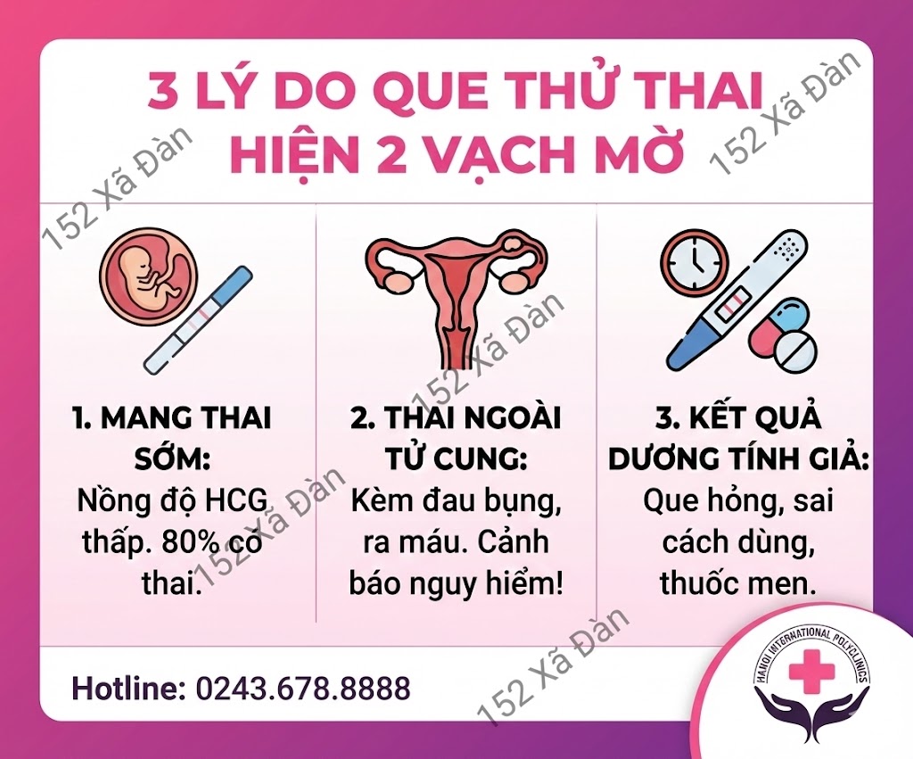 Tuy nhiên, việc que thử không hiện rõ vạch đậm trong một số trường hợp cũng có thể là dấu hiệu cảnh báo tình trạng bất thường, đặc biệt khi vạch mờ kéo dài hoặc kèm các triệu chứng lạ như đau bụng, ra máu nâu… Theo chia sẻ của bác sĩ Duyên, dưới đây là 3 nguyên nhân phổ biến nhất khiến chị em thấy 2 vạch mờ: