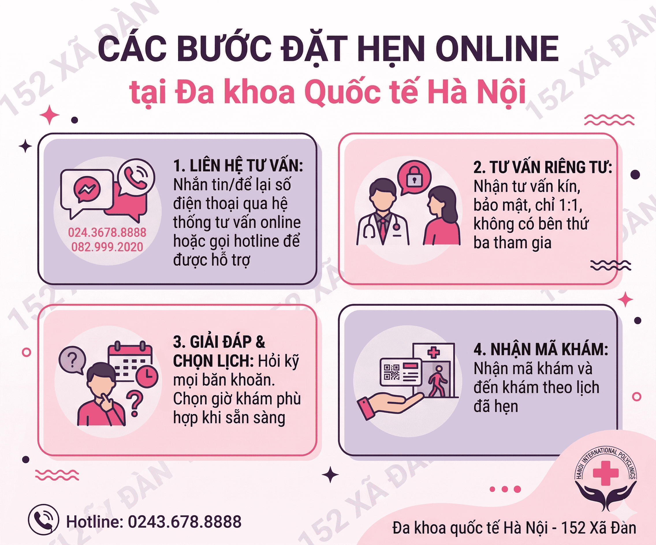 Tuy nhiên, thực tế tại Đa khoa Quốc tế Hà Nội, quy trình tư vấn được xây dựng để đảm bảo kín đáo ngay từ bước đầu tiên với các bước như sau: